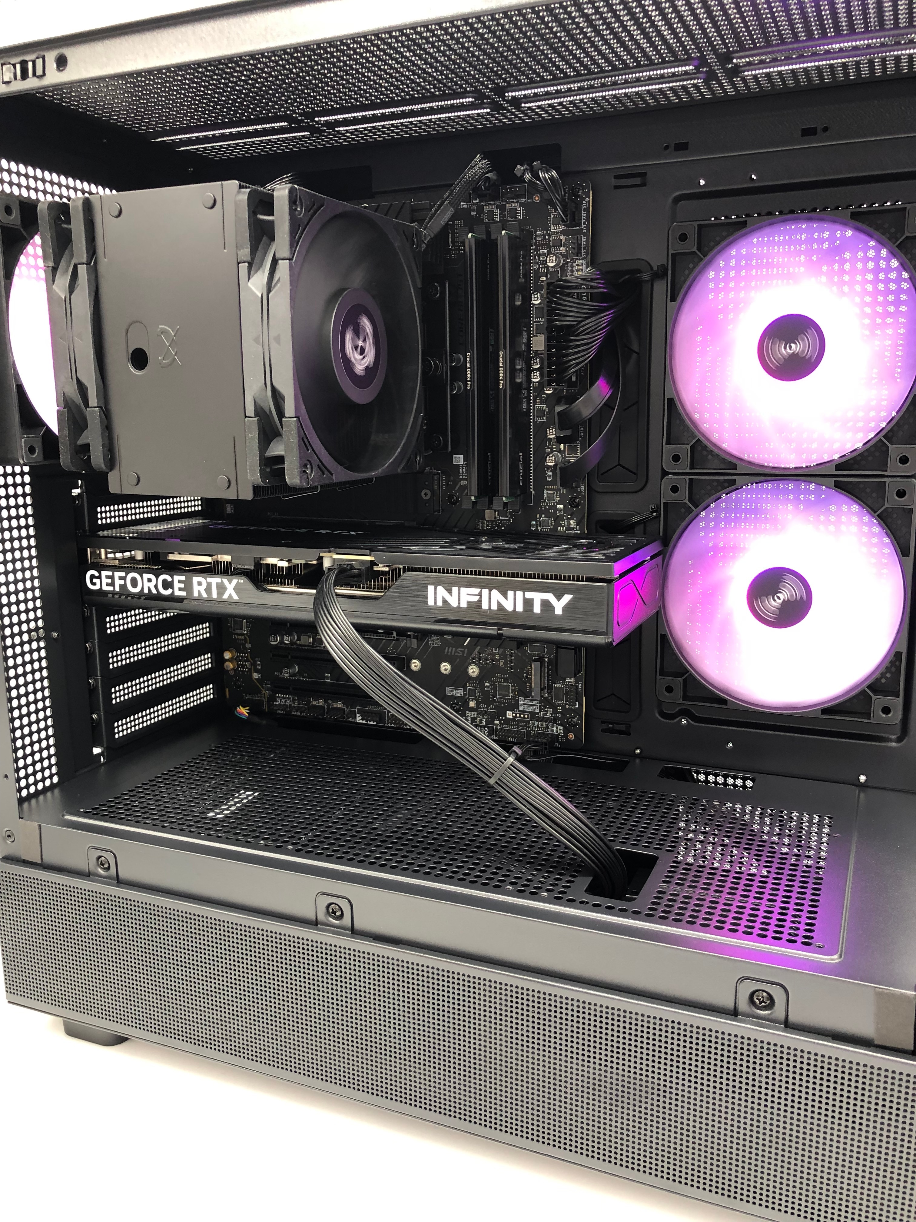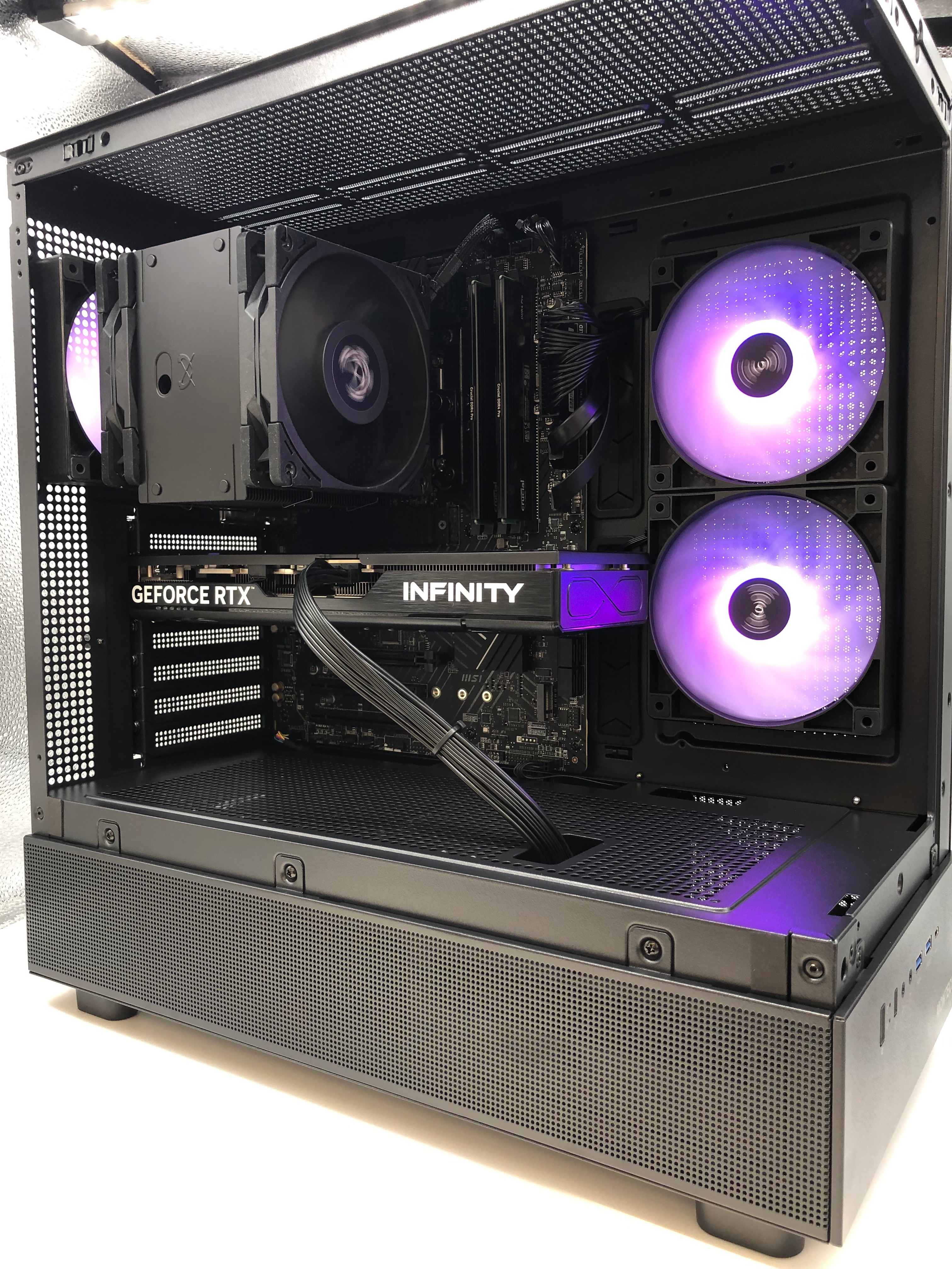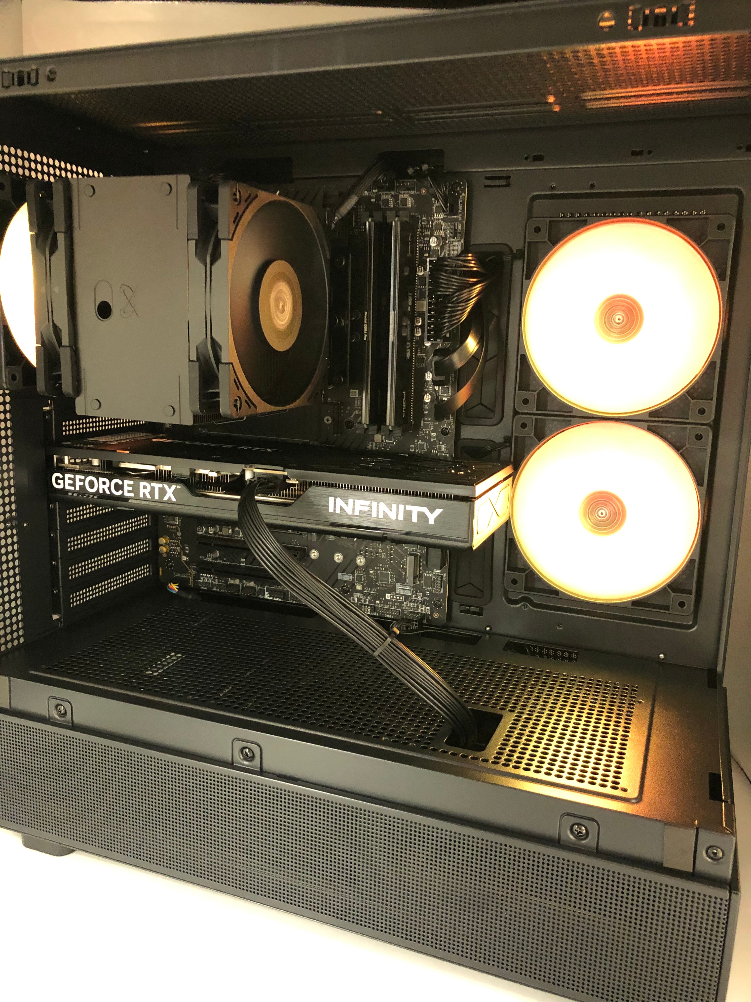 ケース、マザーボード、CPUクーラー、電源、各種パーツを黒で統一し、シックで高級感のある仕上がりになりました。XRケースのデザインがパーツとの調和を引き立てます。